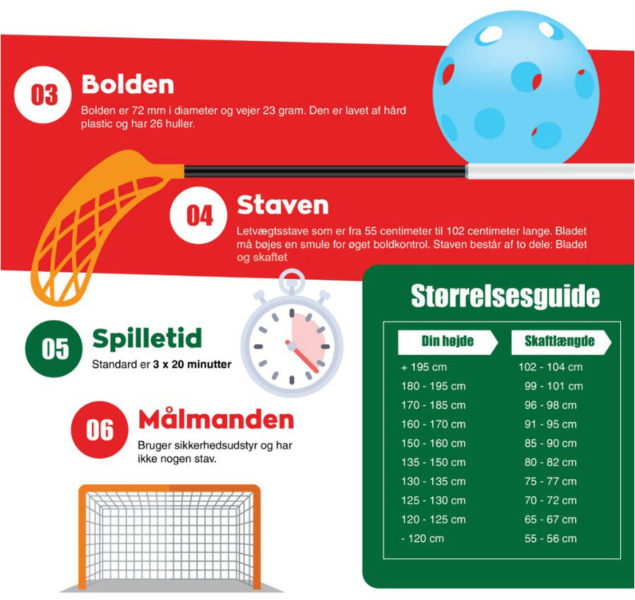 Der findes både højre- og venstrehånds floorballstave. Hvis det føles mest naturligt for dig at føre bolden frem i din højre side, eller hvis du holder din venstre hånd øverst på skaftet, så skal du vælge en højrestav. Og selvfølgelig skal du så tilsvarende vælge en venstrestav, hvis det modsatte er tilfældet. Længden på din floorballstav skal cirka svare til længden fra gulvet og op til din navle. Bemærk dog, at længden på vores stave altid er angivet uden bladet. Bladet måler omkring 10-15 centimeter, som du skal trække fra ”navlemålet”, for at få den rigtige længde på staven.
